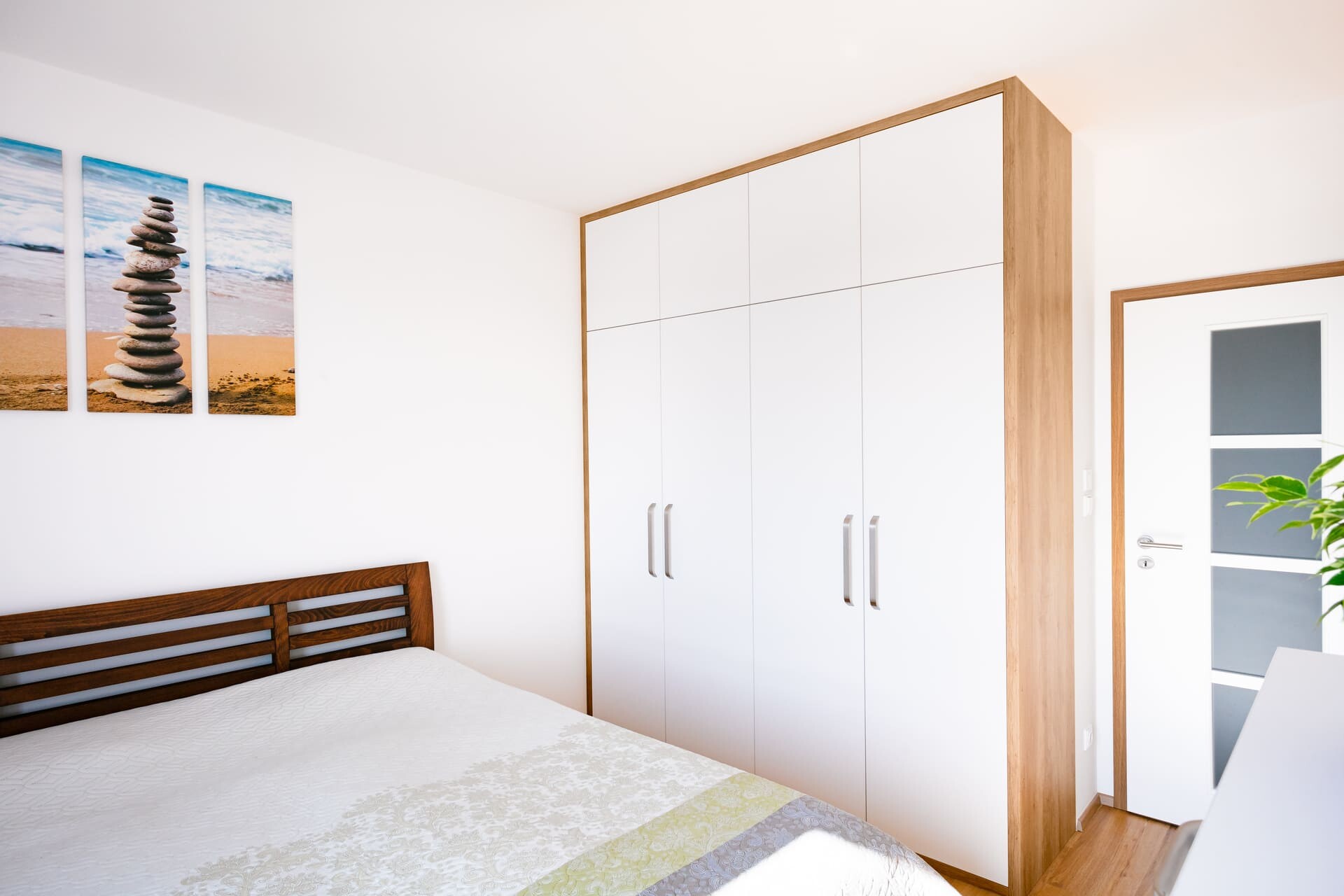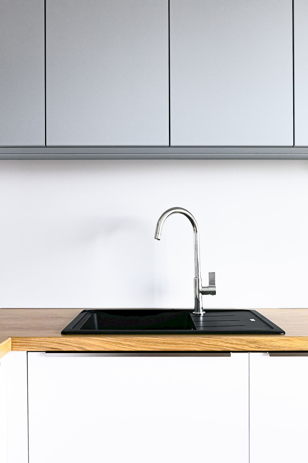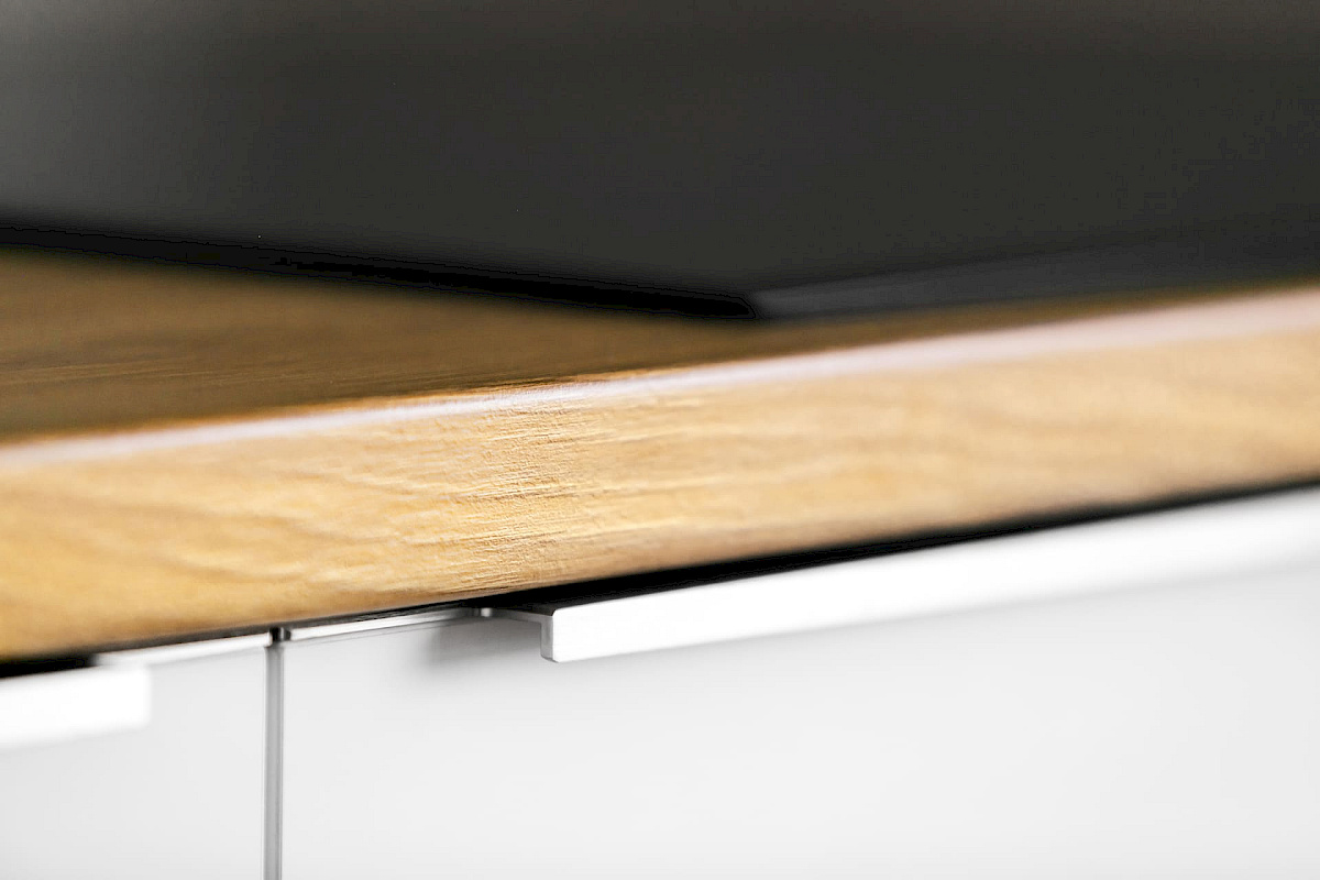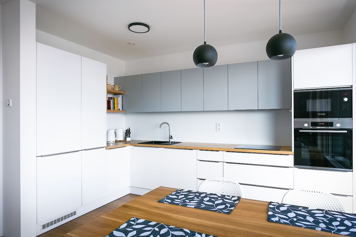 Pro byt v Roztokách jsme volili materiály tak, aby sjednocovaly jednotlivé místnosti a aby byt působil kompaktním a příjemným dojmem. Kuchyně v odstínu Perfect Matt Alpská bílá od firmy Egger slibuje odolnost vůči otiskům prstů a odpovídá představám majitele o praktickém řešení kuchyně. Pro ozvláštnění byla bílá doplněna také šedými dvířky a nerezovými úchytkami.