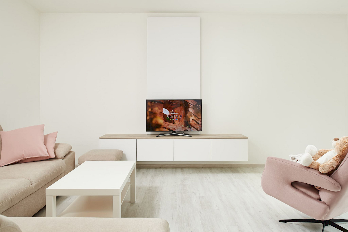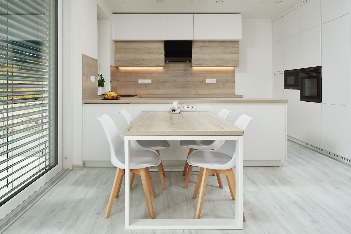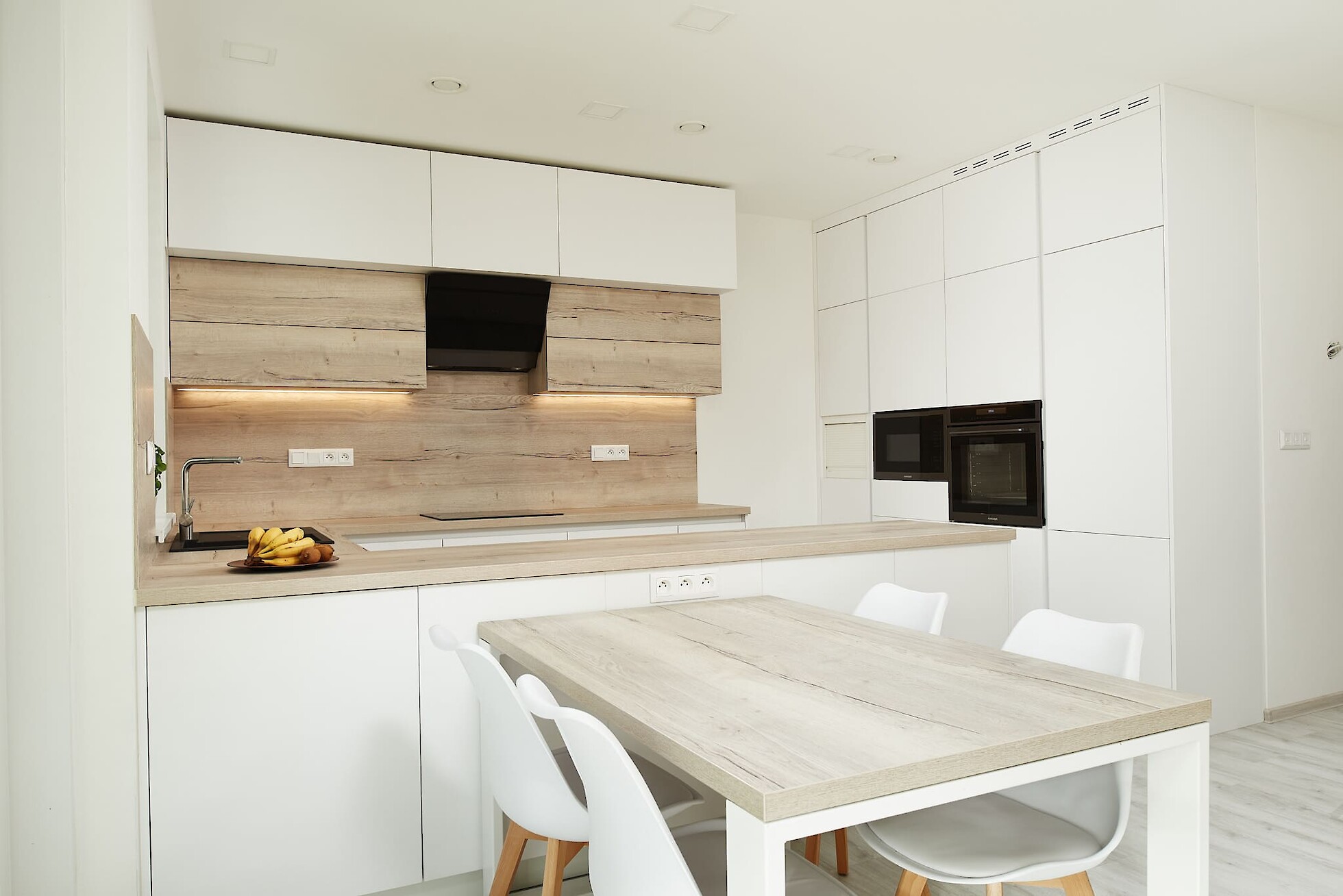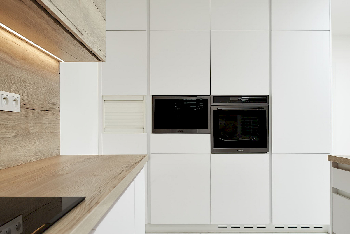 Velmi pohodlným a funkčním řešením může být kuchyňská linka v půdorysu písmene U. Toto navržení kuchyně poskytuje dostatek úložných prostor pro nádobí i spotřebiče a zároveň dostatek pracovní plochy pro jednoho i více lidí najednou. Díky svému rozvržení je v takové kuchyni vše po ruce a s výběrem správných dekorů je výsledný dojem velmi útulný. Pro kuchyň v Bučovicích jsme zvolili oblíbenou kombinaci Alpské bílé od firmy Egger a dřevodekoru, který je zde zastoupen bílým dubem Halifax z kolekce Feelwood. Jedná se o dekor, který krásně vyniká svou prořezávanou strukturou a působí dojmem opravdového dřeva. I proto byl tento dekor zvolen jako jednotící prvek celého bytového interiéru také pro nábytek v předsíni i ložnici, které panuje krásná podsvětlená postel s pohybovým čidlem.