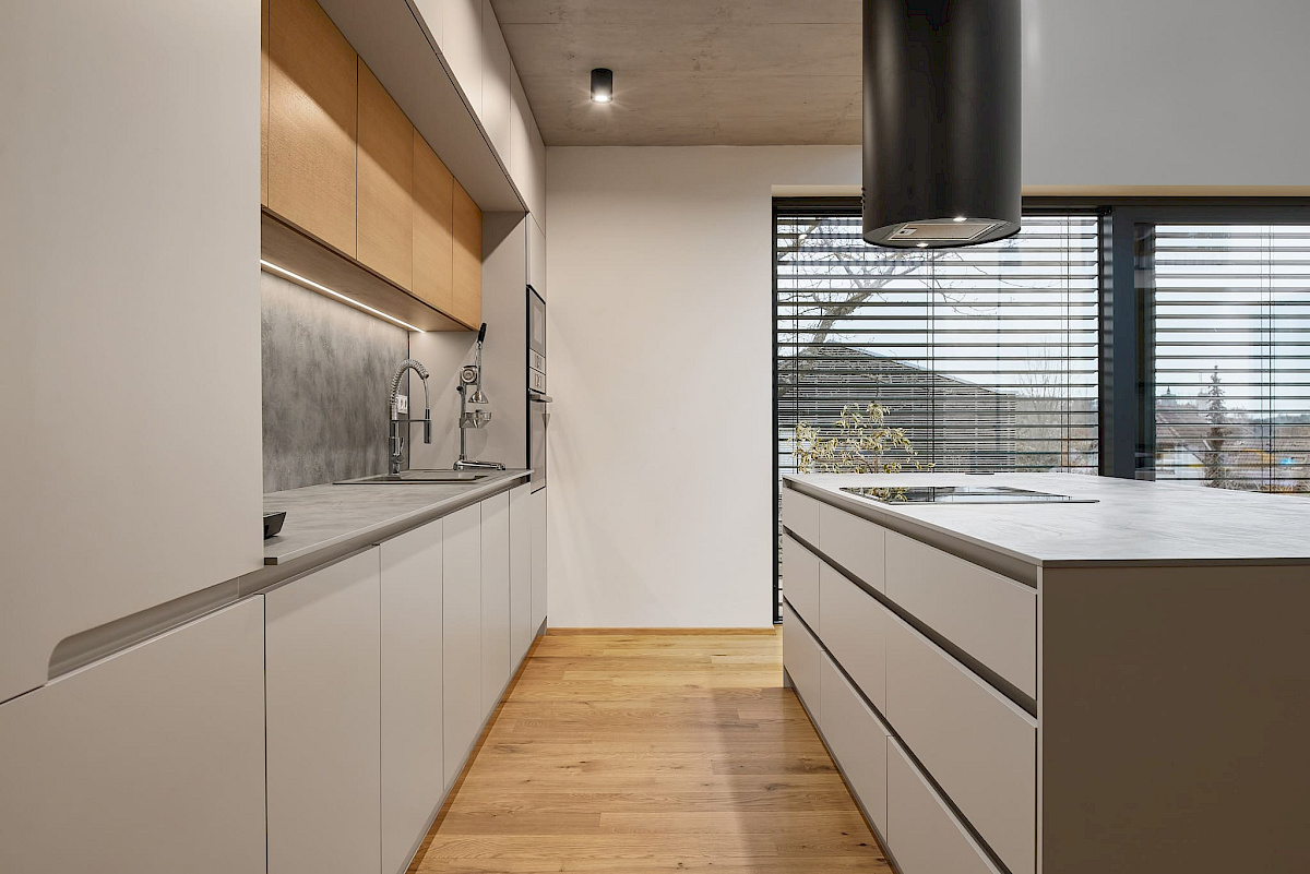Realizaci tohoto rodinného domu jsme pojali moderně a minimalisticky. Čistý a jednoduchý design působivě propojuje industriální šedou s bílou barvou a dřevem. Elegantní a praktické řešení kuchyně, obývacího prostoru, ale i koupelny a ložnice.
