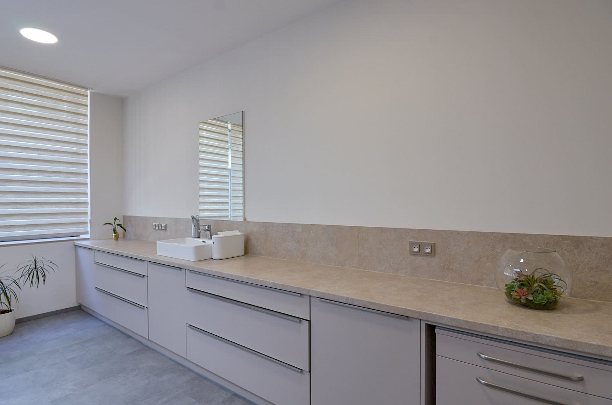 Zubní ordinaci DentArt v Brně jsme chtěli zařídit v elegantním stylu a čistých liniích. Při realizaci čekárny, několika ordinací pro lékaře, hygieniky i zdravotní sestry, denní místnosti i skladu jsme použili jednotné dekorativní materiály od firmy Egger v jemných odstínech moderní šedé barvy. Chcete interiér na míru? Ozvěte se nám a společně to vymyslíme!